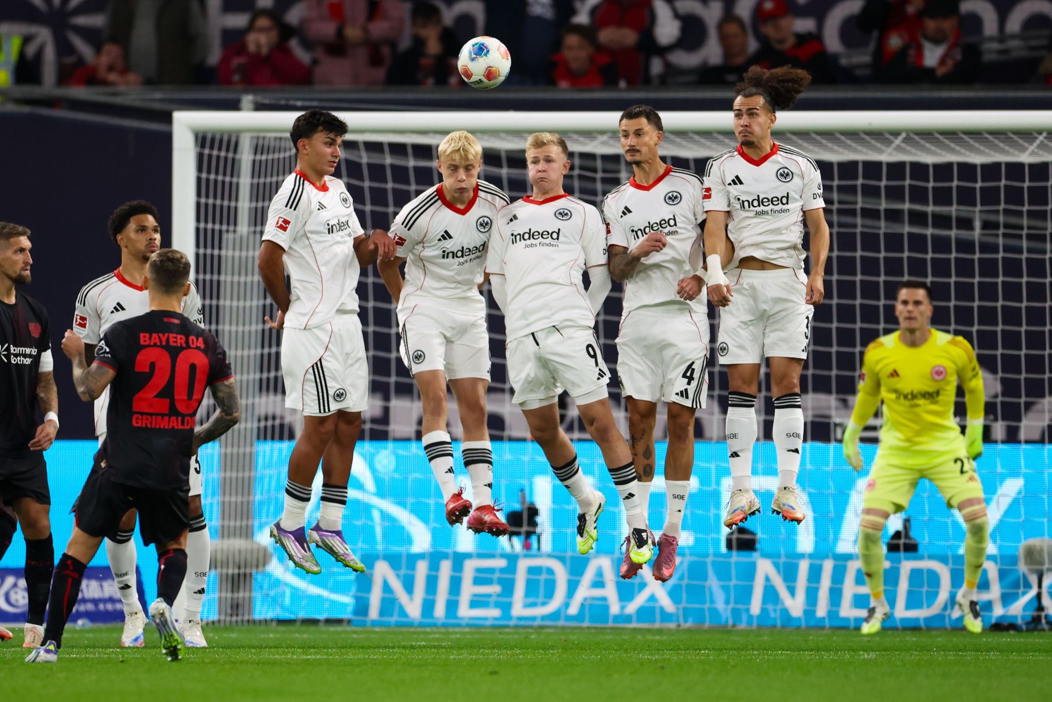 Eine gute Einzelaktion von Leverkusens Nathan Tella, ein Foul und ein Freistoß sorgten dann jedoch für die frühe Bayer-Führung. Grimaldo hob den Ball über die Mauer, traf den Pfosten und vom Körper von Eintracht-Keeper Michael Zetterer sprang das Spielgerät ins Tor.